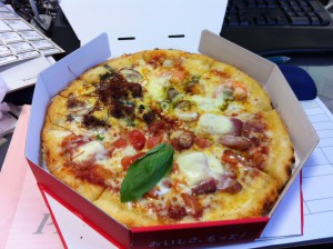 昼に宅配ピザ(2040円)。Mサイズだが思ったよりも小さくて、全部食べちゃった。