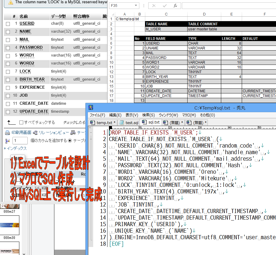 TABLEをExcelで準備するとマクロでSQLを自動生成。