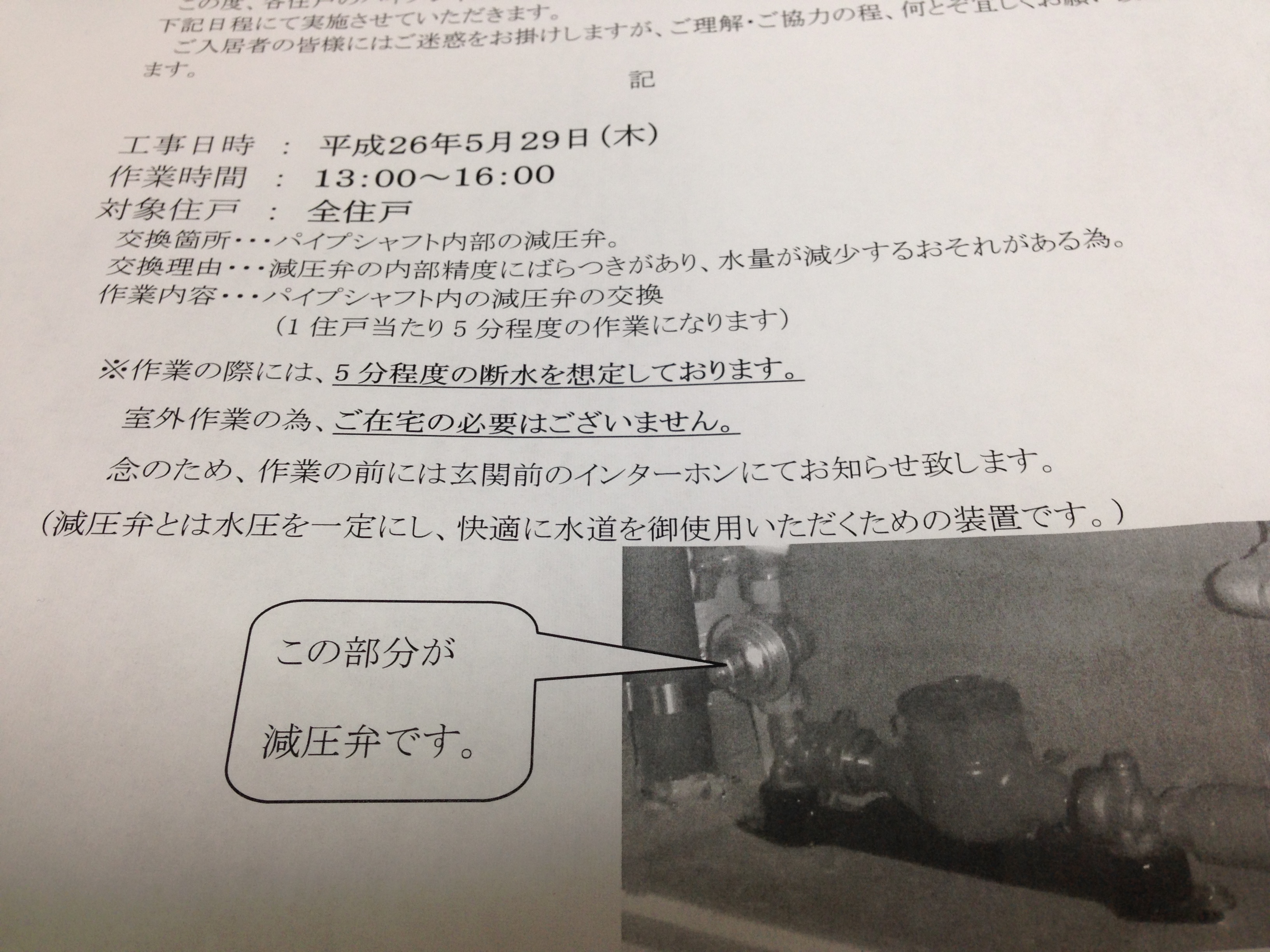 マンションの水圧調整でパーツ交換を事前に聞いていたが、