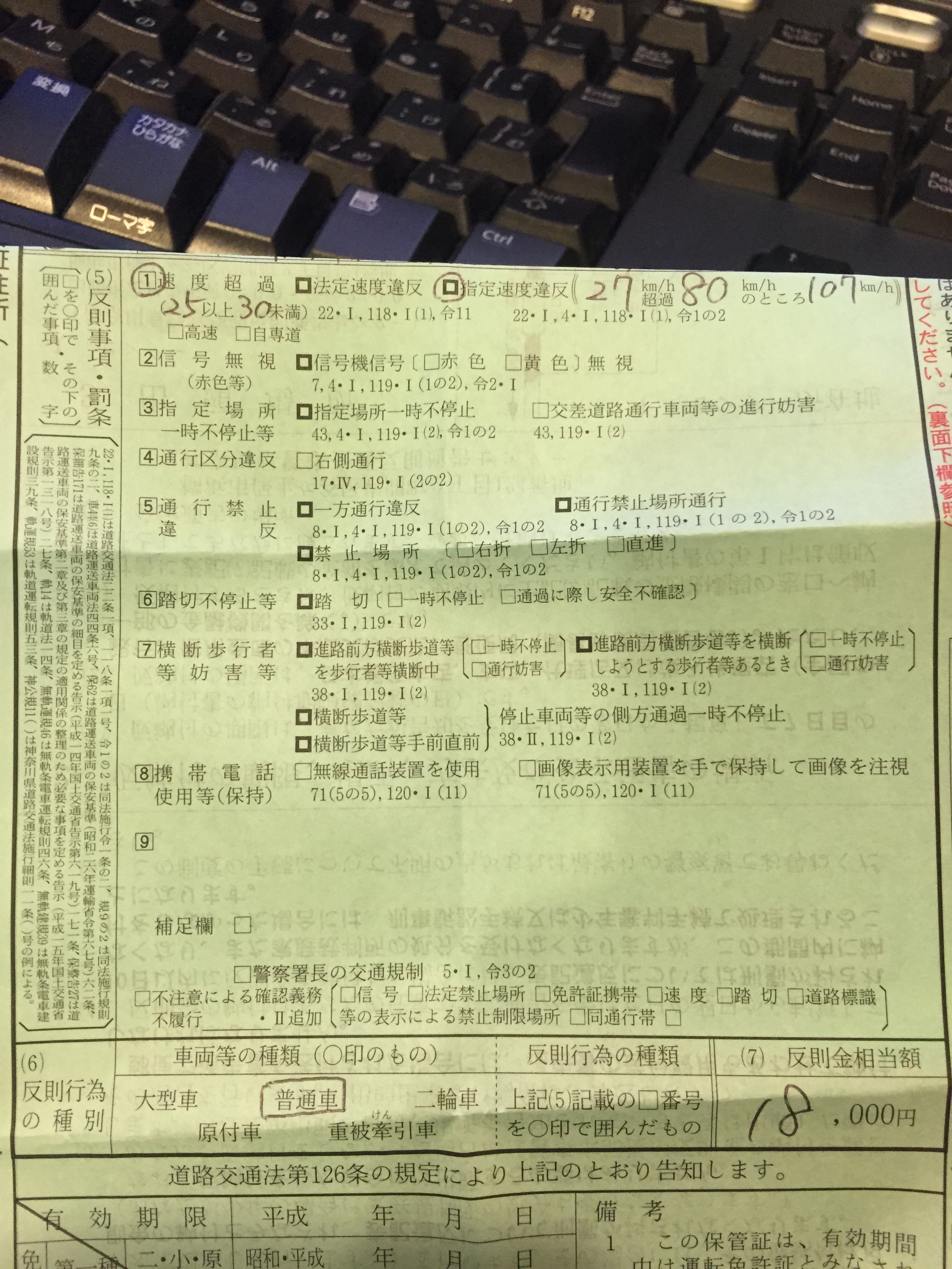 27kmオーバーで107km 減点2点 罰金1.8万円