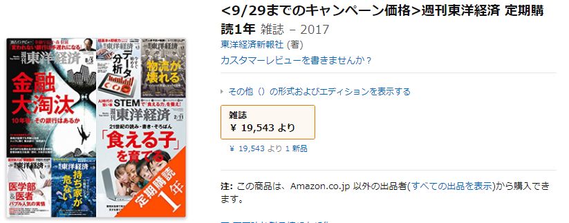 09/19 投稿日時: 2017年9月19日 投稿者: xvax 返信 dマガジンで読んでいる週刊東洋経済だが、 キャンペーンで1年間が半額弱。 しかもAmazonで決済出来るということで注文してみた。 奥さんのお父さん+待合室に置いて貰う予定。 奥さんの誕生日プレゼントが届いたので、1ヶ月も早いがプレゼントした。 喜んでもらえて幸せです。