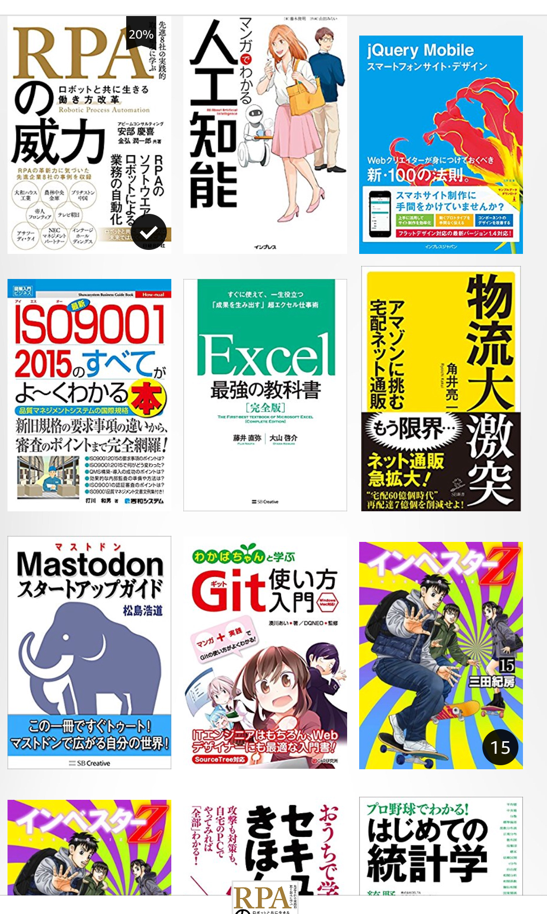 05/07 投稿日時: 2018年5月7日 投稿者: xvax 返信 昨夜購入した電子書籍2つを電車内で読む。 ・AI+漫画 ・RPA 特にRPAは目先必要となりそうなので、急いで読みたい。 *次に読むRPA本も決まっているが、、、 昼休みにもAIを読む。RPAはPC非対応だったのでiPhoneに入れた見た。 活字ばかりなので大丈夫でしょう。 ヨドバシが30%ポイント還元と言う事で、2冊購入。 ・空母いぶき 9(小学館) [電子書籍] ・まるわかり!RPA(日経BP社) [電子書籍]