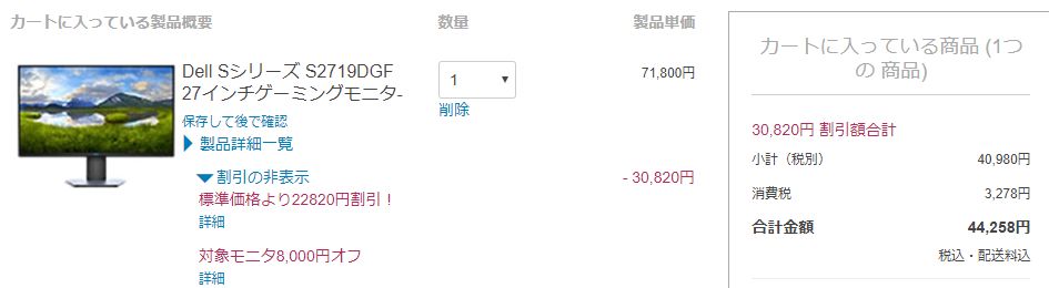 09/10 投稿日時: 2019年9月10日 投稿者: xvax 返信 ランチはコールがあったので、和幸で豚カツ弁当を食べながら。 明日M2 SSDが届くから、土曜日にPC組立を思案中。 そして突然、液晶モニターの衝動買いをやってしまった。 27インチ QHD解像度が欲しい!と言うことで、こちらのモニタ。 Dell Sシリーズ S2719DGF 27インチゲーミングモニター 注文日: 2019/09/10 注文合計: 44,258円 割引額合計: 30,820円 割引率43%も驚異的! 夜は20時と、21時の2つのコールへ参加。