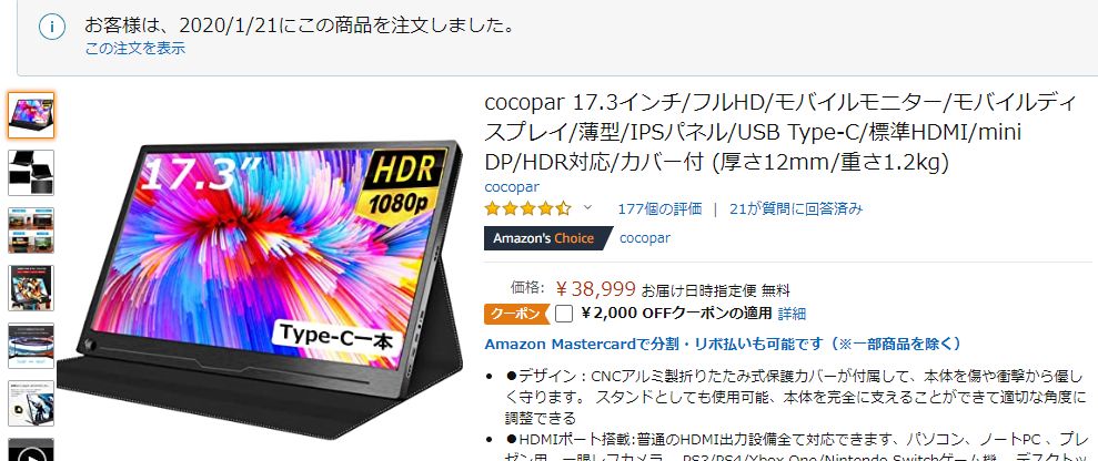 cocopar 17.3インチ/フルHD/モバイルモニター/モバイルディスプレイ