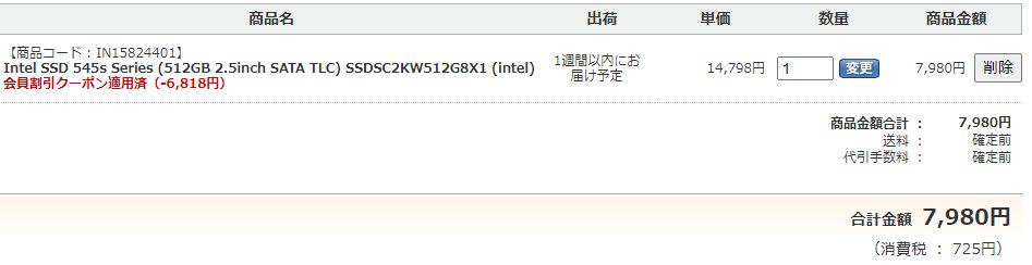 インテルのSSDが納品された。