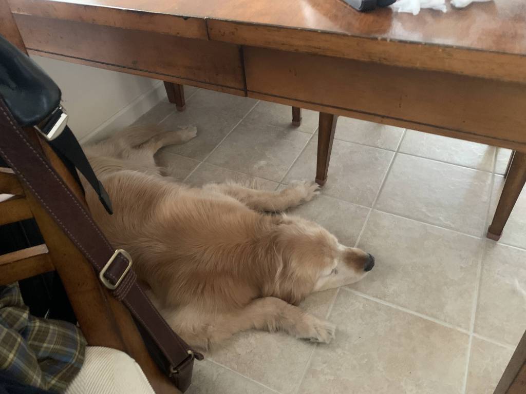 大型犬はテーブルの下に潜り込んでしまった。
