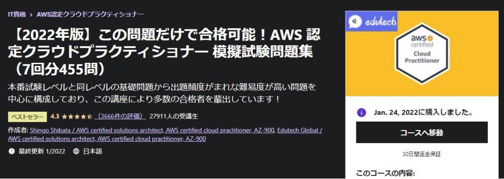 01/24 投稿日時: 2022年1月24日 投稿者: xvax 返信 今日から子供が1週間ほど自宅。昼食は子供の分も準備。今日はハンバーグにした。 チュチュの入院している部屋のグレードを下げた。当時のチャマと同じグレード。今より半額。 AWSの講義が終わった。チートシートを作成が残っている。勢いで試験用の講義も購入した。 【2022年版】この問題だけで合格可能!AWS 認定クラウドプラクティショナー 模擬試験問題集(7回分455問) 子供からBeats Solo3を回収した。購入時は2.2万円もしたのに売却下取は6千円。。。(1ヶ月も使っていないのに)結局奥さんが使うこととなった。