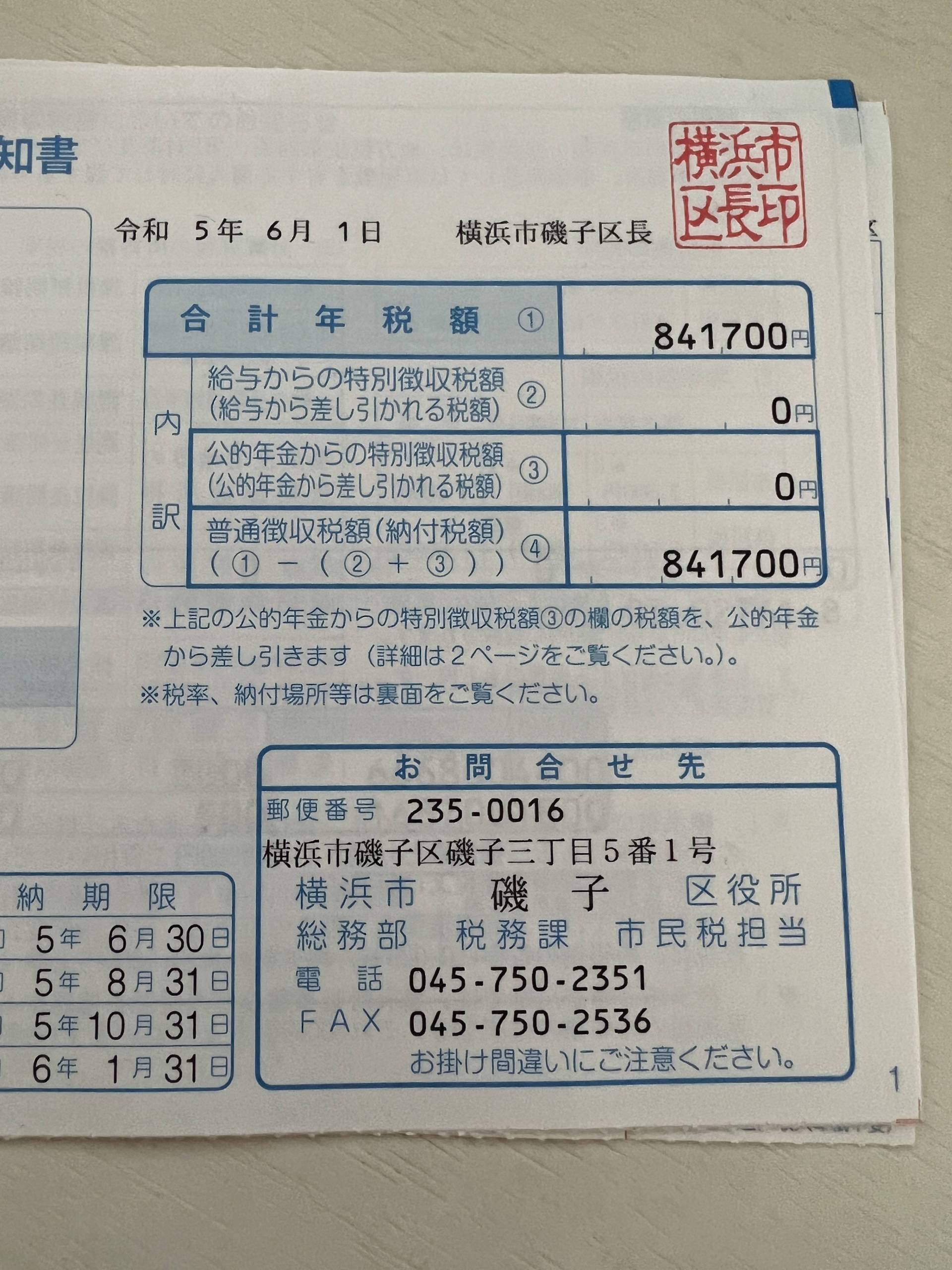 昨日帰宅したら、市県民税の振込用紙が届いた。84万円。。。(汗)