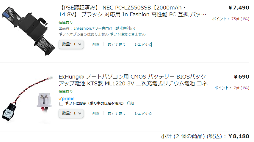 そこで、それぞれのバッテリーを注文した。 計8000円強